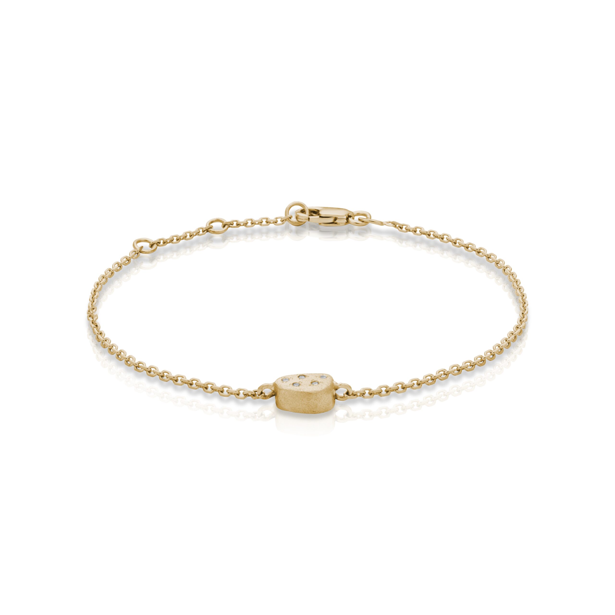 Az Auróra brill karkötő matt arany felülettel és öt darab 1 MM-ES TOP WESSELTON VVS BRILL csiszolású gyémánttal készült, a kollekció jellegzetes medálelemének méretével (7,2 × 5 mm, magassága 2,8 mm).
