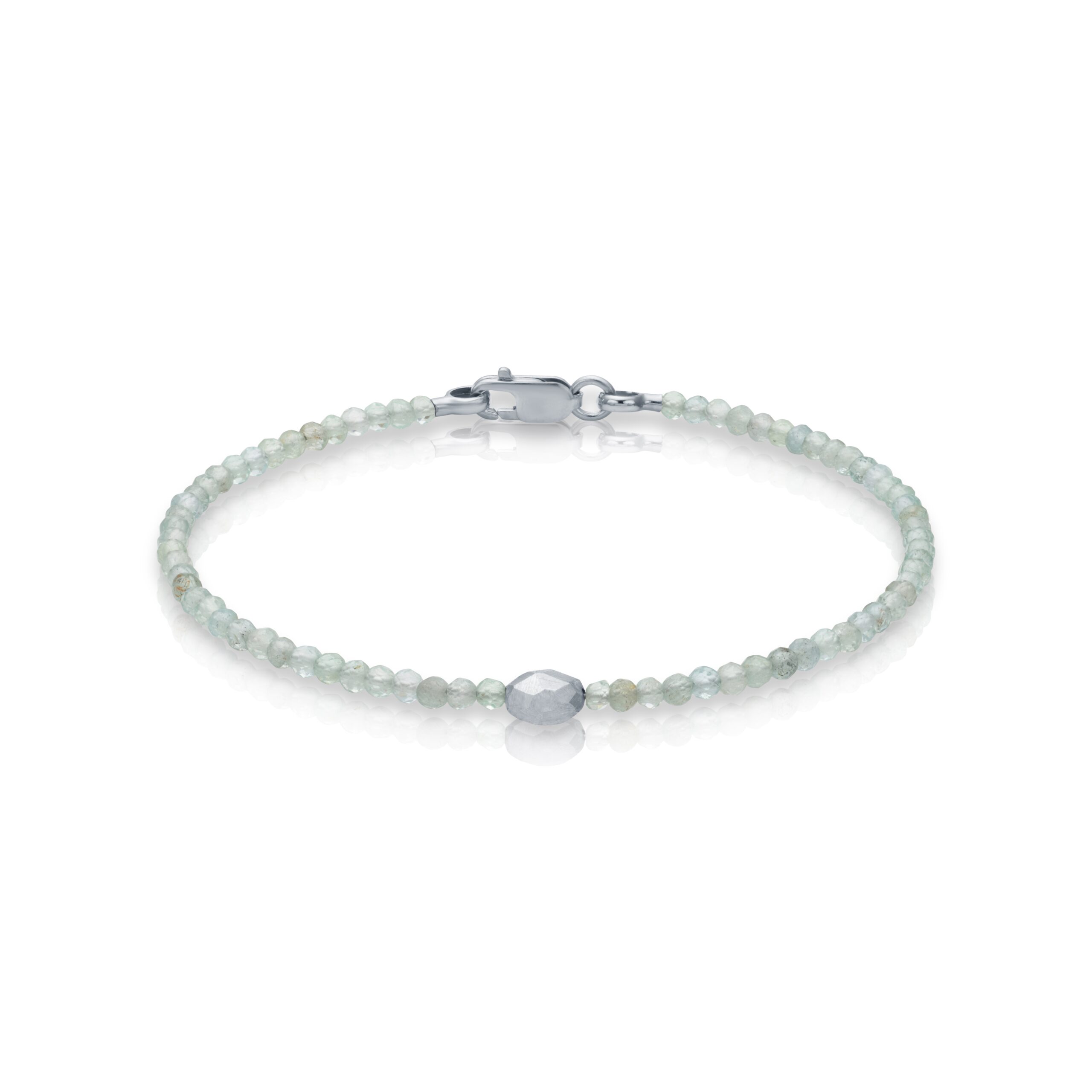 A NÓVA gyöngyös akvamarin karkötő az akvamarin világos, kékeszöld árnyalatát ötvözi a központi, fehéraranyból készült, facettált 14 K arany medál eleganciájával. A fehérarany csat letisztult, modern részletként teszi teljessé a darabot.
